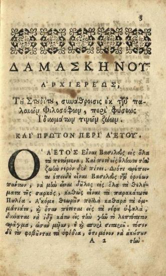 Δαμασκηνὸς Στουδίτης. Μερικὴ Διάγνωσις ἐκ τῶν παλαιῶν φιλοσόφων περὶ φύσεως, καὶ ἰδιωμάτων τινῶν ζώων συναθροισθεῖσα παρὰ τοῦ ἐν Ἀρχιερεῦσι Λογιωτάτου, Δαμασκηνοῦ τοῦ Στουδίτου. Καὶ τώρα πάλιν μὲ πολλὴν ἐπιμέλειαν διορθωμένη..., Βενετία, Νικόλαος Σάρος, 1744.