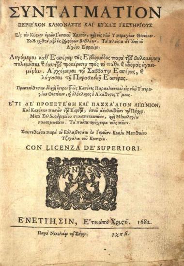 Ματθαῖος Τζιγάλας (Κιγάλας). Συνταγμάτιον περιέχον Κανόνας τε καὶ Εὐχὰς ἱκετηρίους... προσετέθη καὶ Πασχάλιον αἰώνιον..., Βενετία, Νικόλαος Σάρος, 1682.
