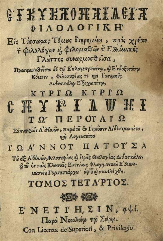 Ἰωάννης Πατούσας. Ἐγκυκλοπαιδεία Φιλολογικὴ..., τ. Β´, Δ´, Βενετία, Νικόλαος Σάρος, 1710.