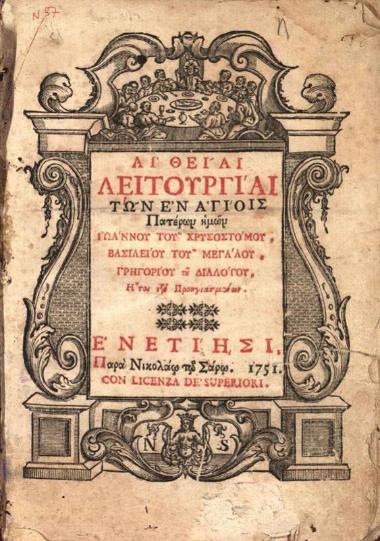 Αἱ Θεῖαι καὶ Ἱεραὶ Λειτουργίαι..., Βενετία, Νικόλαος Σάρος, 1751.