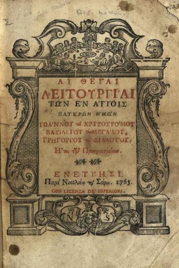 Αἱ Θεῖαι καὶ Ἱεραὶ Λειτουργίαι..., Βενετία, Νικόλαος Σάρος, 1765.