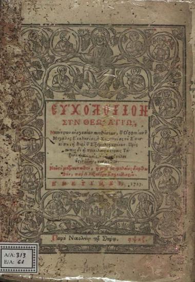 Εὐχολόγιον σὺν Θεῷ Ἁγίῳ... διορθωθέν, παρὰ Ἀλεξάνδρου Καγκελλαρίου..., Βενετία, Νικόλαος Σάρος, 1727.