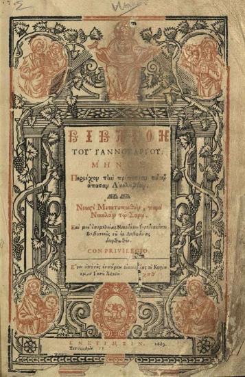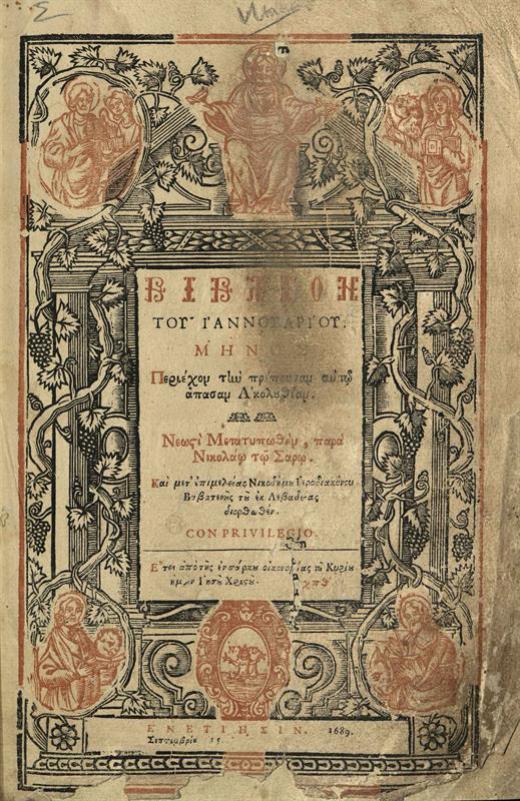 Βιβλίον τοῦ Ἰαννουαρίου μηνὸς... μετ᾽ ἐπιμελείας Νικοδήμου ἱεροδιακόνου Βαβατενοῦς τοῦ ἐκ Λεβαδείας διορθωθέν, Βενετία, Νικόλαος Σάρος, 1689.