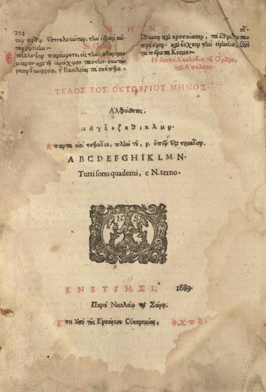 Βιβλίον τοῦ Ὀκτωβρίου μηνὸς... μετ᾽ ἐπιμελείας Νικοδήμου... Βαβατενοῦς..., Βενετία, Νικόλαος Σάρος, 1689.
