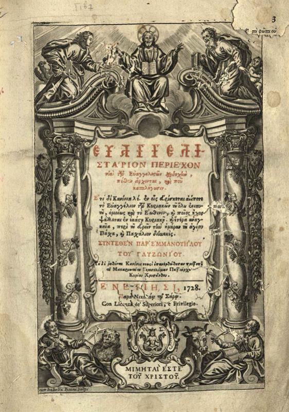 Εὐαγγελιστάριον περιέχον τὴν τῶν Εὐαγγελιστῶν διαδοχήν, πόθεν ἄρχονται καὶ ποῦ καταλήγουσιν ἔτι δὲ κανόνια..., συντεθὲν παρ᾽ Ἐμμανουήλου τοῦ Γλυζωνίου..., Βενετία, Νικόλαος Σάρος, 1728.