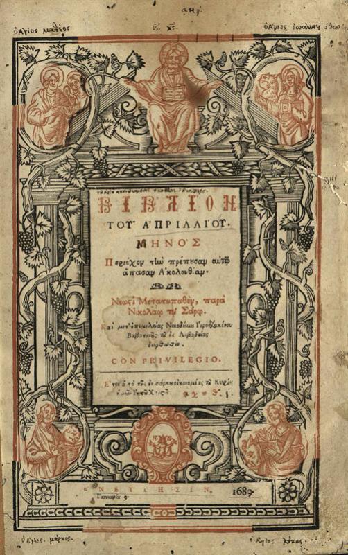 Βιβλίον τοῦ Ἀπριλλίου μηνὸς... μετ᾽ ἐπιμελείας Νικοδήμου... Βαβατενοῦς..., Βενετία, Νικόλαος Σάρος, 1689.