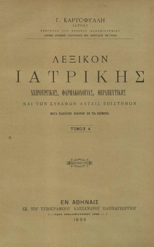 Γ. Καρυοφύλλης, Λεξικὸν Ἰατρικῆς..., Ἀθήνα, ἐκ τοῦ τυπογραφείου Ἀλέξανδρου Παππαγεωργίου, τ. Α´-Β´, 1895.