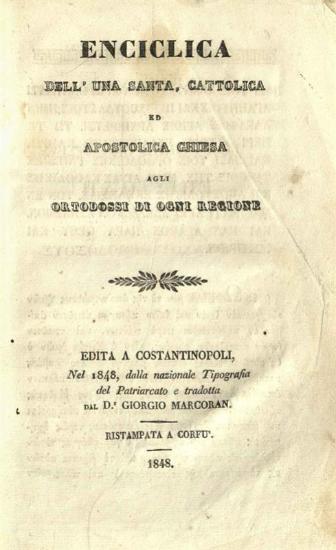 Ἐγκύκλιος τῆς Μίας Ἁγίας Καθολικῆς καὶ Ἀποστολικῆς Ἐκκλησίας, Ἐπιστολὴ πρὸς τοὺς ἁπανταχοῦ Ὀρθοδόξους, Κωνσταντινούπολη, Πατριαρχικὴ τοῦ Γένους Τυπογραφία, ἀνατύπωση: Κέρκυρα, 1848.