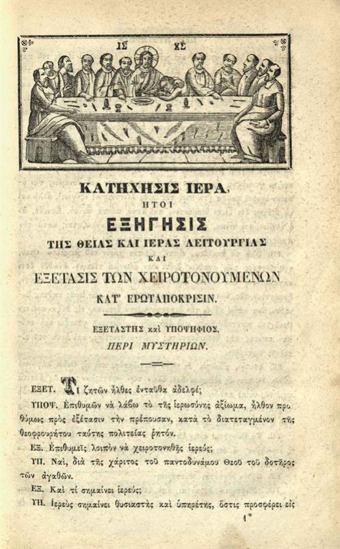 Νικόλαος Βούλγαρης. Ἱερὰ Κατήχησις ἤτοι Ἐξήγησις τῆς Θείας καὶ Ἱερᾶς Λειτουργίας καὶ ἐξέτασις τῶν χειροτονουμένων... διασκευασθεῖσα ἐπὶ τὸ καθαρώτερον ὕφος... Μέρος Πρῶτον..., Κωνσταντινούπολη, Πατριαρχικὸ Τυπογραφεῖο, 1861.