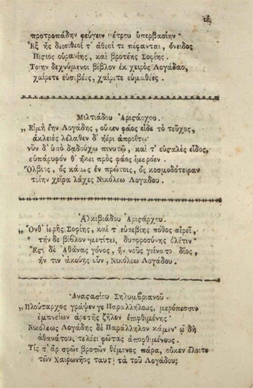 - [Δημήτριος Καταρτζής], Παράλληλον φιλοσοφίας καὶ χριστιανισμοῦ, ἀθεϊσμοῦ, καὶ δεισιδαιμονίας, ἤτοι ἐγκώμιον τοῦ ἀληθινοῦ φιλοσόφου, μακαρισμὸς τοῦ ὀρθόδοξου Χριστιανοῦ, ψόγος τοῦ ἀθέου, ταλανισμὸς τοῦ δεισιδαίμονος... καί τις ἐπιστολὴ... Εὐγενίου, καὶ... ὠδάριον ἠθικὸν Ν. Τοῦ Λογάδου..., Κωνσταντινούπολη, Πατριαρχικὸ Τυπογραφεῖο, 1830.