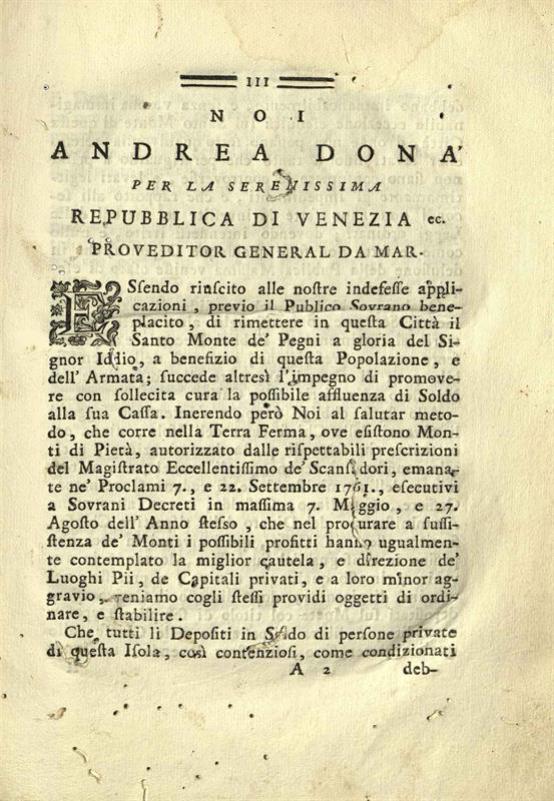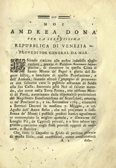 Regole e Leggi per il buon governo del Santo Monte di Pietà di Corfu stabilite nel Risorgimento di Esso pio Luoco dal N.H.f. Andrea Dona Proveditor General Da Mar..., Βενετία, Ἀντώνιος Πινέλλι, 1768.