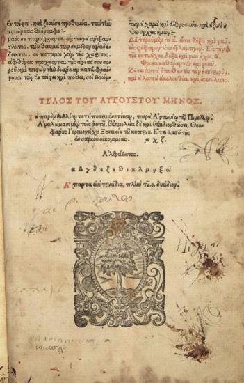 Βιβλίον τοῦ Αὐγούστου μηνὸς περιέχον τὴν πρέπουσαν αὐτῷ ἅπασαν ἀκολουθίαν... παρὰ Θεοφάνους Ἱερομονάχου τοῦ Ξενακίου ἐπιμελῶς διορθωθέν, Βενετία, Ἀντώνιος Πινέλλος, 1607.