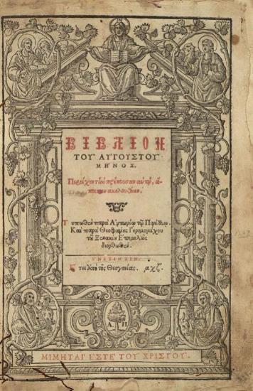 Βιβλίον τοῦ Αὐγούστου μηνὸς περιέχον τὴν πρέπουσαν αὐτῷ ἅπασαν ἀκολουθίαν... παρὰ Θεοφάνους Ἱερομονάχου τοῦ Ξενακίου ἐπιμελῶς διορθωθέν, Βενετία, Ἀντώνιος Πινέλλος, 1607.