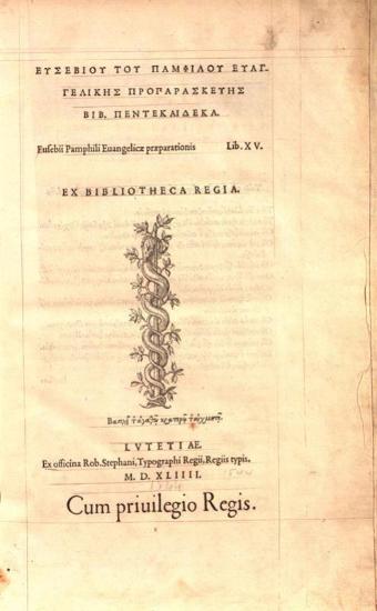 Εὐσέβιος ὁ Παμφίλου. Εὐαγγελικὴ Προπαρασκευή, Παρίσι, Ροβέρτος Στέφανος, 1544.