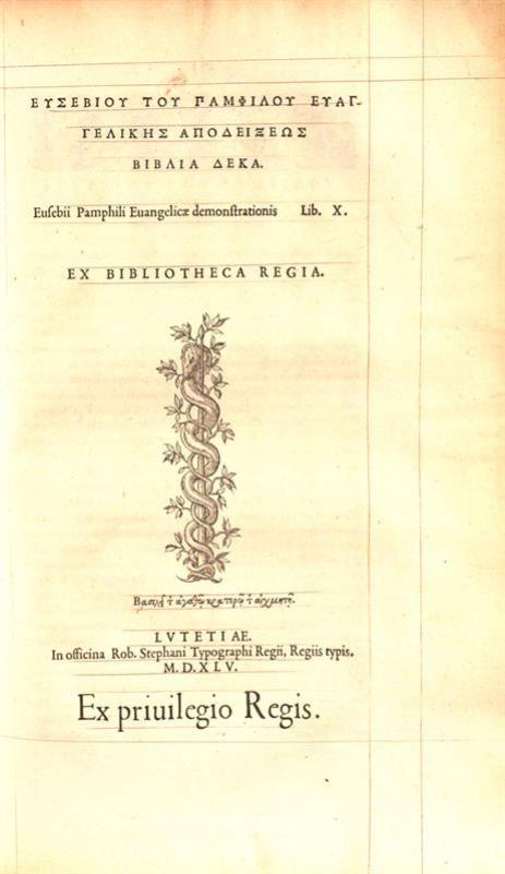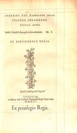 Εὐσέβιος ὁ Παμφίλου. Εὐαγγελικὴ Προπαρασκευή, Παρίσι, Ροβέρτος Στέφανος, 1544.