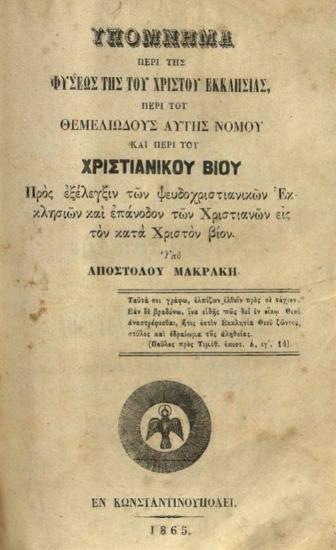 Εὐγένιος Βούλγαρις, Ἑκατονταετηρὶς τῶν ἀπὸ Χριστοῦ Σωτῆρος Ἐνανθρωπήσαντος, Ἡ πρώτη κατὰ χρονικὴν πρόοδον ἐν ἐπιτομῇ ἐκτεθεῖσα ---, Ἀθήνα, Νικόλαος Ρουσόπουλος, 1865.