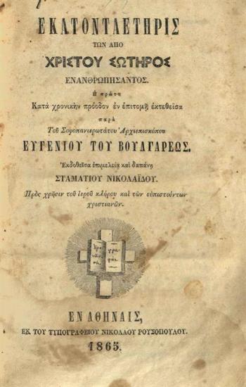 Εὐγένιος Βούλγαρις, Ἑκατονταετηρὶς τῶν ἀπὸ Χριστοῦ Σωτῆρος Ἐνανθρωπήσαντος, Ἡ πρώτη κατὰ χρονικὴν πρόοδον ἐν ἐπιτομῇ ἐκτεθεῖσα ---, Ἀθήνα, Νικόλαος Ρουσόπουλος, 1865.