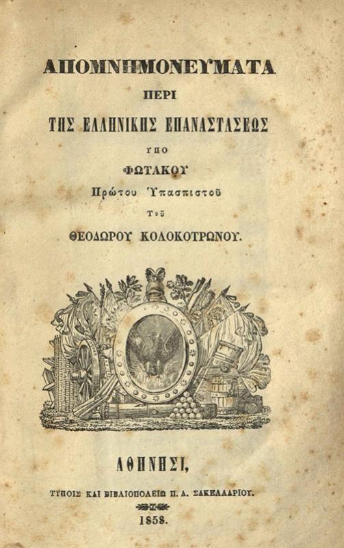 Φωτάκος. Ἀπομνημονεύματα περὶ τῆς Ἑλληνικῆς Ἐπαναστάσεως..., Ἀθήνα, Π.Δ. Σακελλαρίου, 1858.