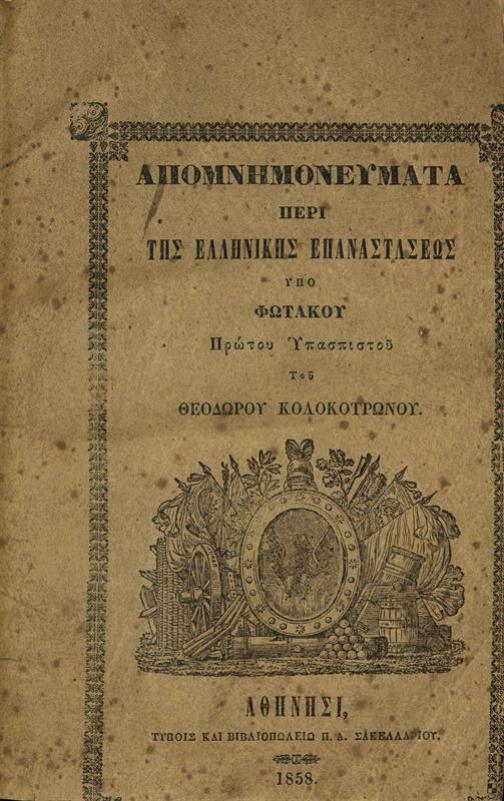 Φωτάκος. Ἀπομνημονεύματα περὶ τῆς Ἑλληνικῆς Ἐπαναστάσεως..., Ἀθήνα, Π.Δ. Σακελλαρίου, 1858.