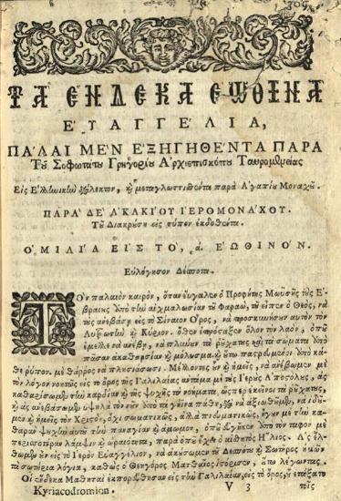 Ἀγάπιος Λάνδος. Βιβλίον καλούμενον Κυριακοδρόμιον ἤγουν Διδαχαὶ καὶ Ὁμιλίαι..., Βενετία, Νικόλαος Σάρος, 1740.