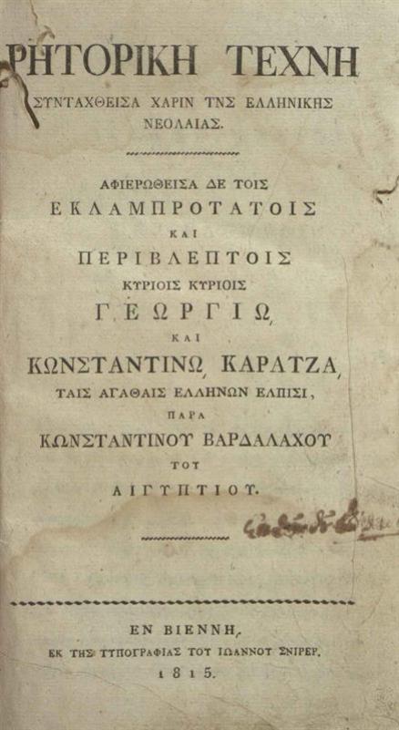Κωνσταντίνος Βαρδαλάχος, Ρητορικὴ Τέχνη ---, Βιέννη, Ἰωάννης Σνίρερ, 1815.