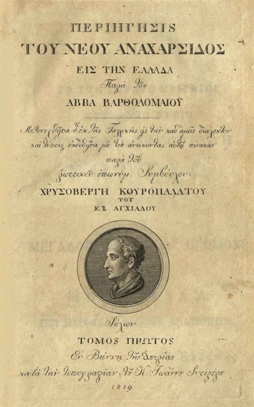 Βαρθολομαῖος ἀββᾶς (J.-J. Barthélemy). Περιήγησις τοῦ Νέου Ἀναχάρσιδος... εἰς τὴν καθ᾽ ἡμᾶς διάλεκτον... παρὰ Χρυσοβέργη Κουροπαλάτου.., Βιέννη, Ἰωάννης Σνείρερος, τ. Α´-Ε´, Ζ´, 1819.
