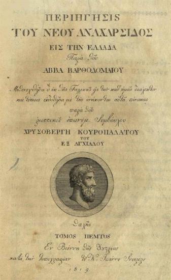 Βαρθολομαῖος ἀββᾶς (J.-J. Barthélemy). Περιήγησις τοῦ Νέου Ἀναχάρσιδος... εἰς τὴν καθ᾽ ἡμᾶς διάλεκτον... παρὰ Χρυσοβέργη Κουροπαλάτου.., Βιέννη, Ἰωάννης Σνείρερος, τ. Α´-Ε´, Ζ´, 1819.