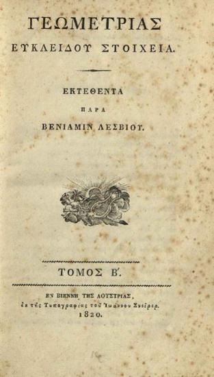 Βενιαμὶν Λέσβιος. Γεωμετρίας Εὐκλείδου Στοιχεῖα..., Βιέννη, Ἰωάννης Σνεῖρερ, τ. Β´, 1820.
