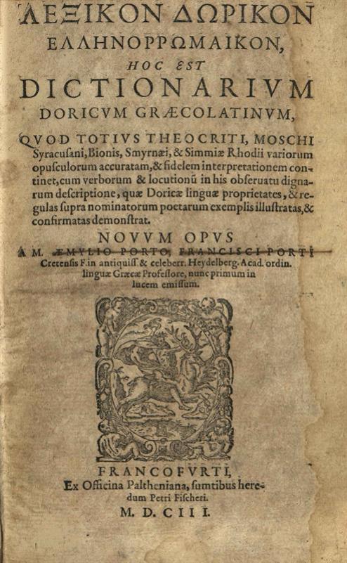 Αἰμίλιος Πόρτος. Λεξικὸν Δωρικὸν Ἑλληνορρωμαϊκὸν..., Novum Opus A M. Emylio Porto..., Φρανκφούρτη, ex officina Paltheniana, sumptibus haeredum Petri Fischeri, 1603.