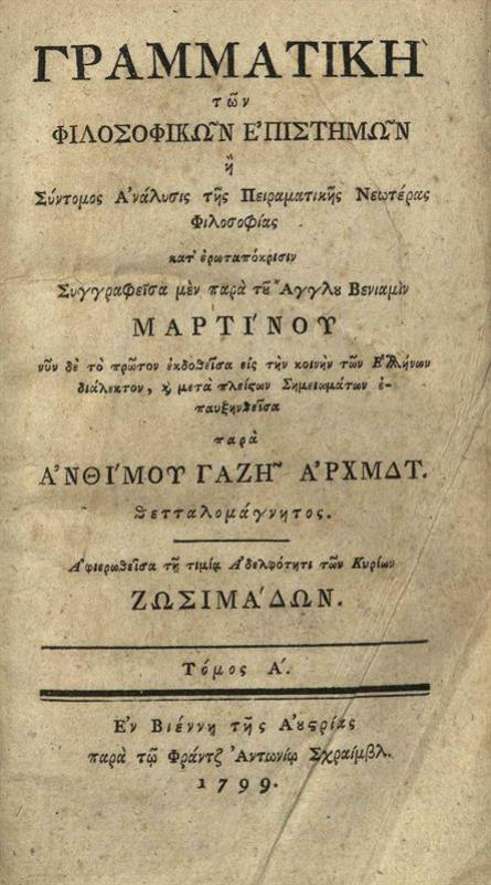 Βενιαμὶν Μάρτιν (Benjamin Martin). Γραμματικὴ τῶν Φιλοσοφικῶν Ἐπιστημῶν ἢ Σύντομος Ἀνάλυσις τῆς Πειραματικῆς Νεωτέρας Φιλοσοφίας κατ᾽ ἐρωταπόκρισιν συγγραφεῖσα μὲν παρὰ τοῦ Ἄγγλου Βενιαμὶν Μαρτίνου... ἐπαυξηθεῖσα παρὰ Ἀνθίμου Γαζῆ..., τ. Α´-Β´, Βιέννη, Φ.Α. Σχραίμβλ, 1799.