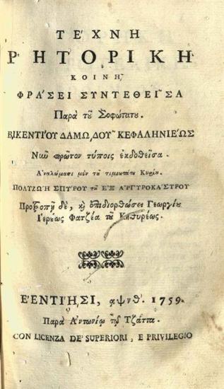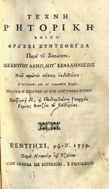 Βικέντιος Δαμωδός. Ἐπίτομος Λογικὴ κατ᾽ Ἀριστοτέλην καὶ Τέχνη ῾Ρητορική...., Βενετία, Ἀντώνιος Τζάτας, 1759.