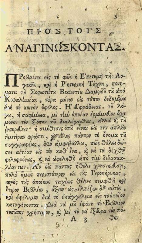 Βικέντιος Δαμωδός. Ἐπίτομος Λογικὴ κατ᾽ Ἀριστοτέλην καὶ Τέχνη ῾Ρητορική...., Βενετία, Ἀντώνιος Τζάτας, 1759.