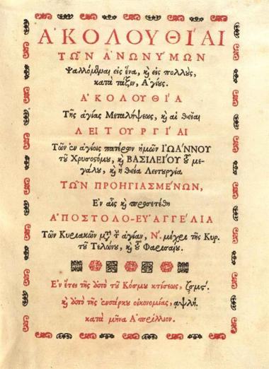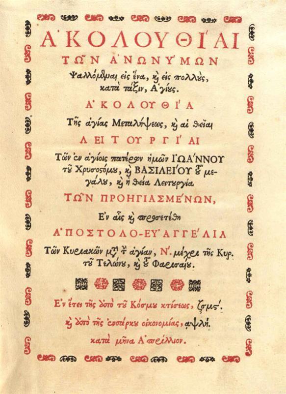 Ἀκολουθίαι τῶν Ἀνωνύμων... Ἀκολουθία... Μεταλήψεως... Λειτουργίαι... Ἀποστολο-Εὐαγγέλια... [Ρώμη, Τυπογραφεῖο Propaganda Fide], 1738.