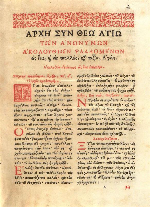 Ἀκολουθίαι τῶν Ἀνωνύμων... Ἀκολουθία... Μεταλήψεως... Λειτουργίαι... Ἀποστολο-Εὐαγγέλια... [Ρώμη, Τυπογραφεῖο Propaganda Fide], 1738.