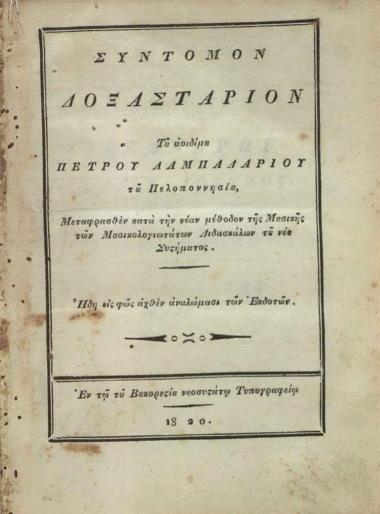Πέτρος Λαμπαδάριος Πελοποννήσιος. Σύντομον Δοξαστάριον τοῦ ἀοιδίμου Πέτρου Λαμπαδαρίου..., μεταφρασθὲν κατὰ τὴν νέαν μέθοδον τῆς μουσικῆς τῶν μουσικολογιωτάτων διδασκάλων τοῦ νέου συστήματος..., Βουκουρέστι, Τυπογραφεῖο Βουκουρεστίου, 1820.