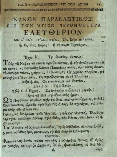 Ἀθανάσιος ὁ Πάριος. Ἡ Θεία καὶ Ἱερὰ Ἀκολουθία... Ἐλευθερίου..., Κωνσταντινούπολη, Τυπογραφεῖο Πατριαρχείου Κωνσταντινουπόλεως, 1811.