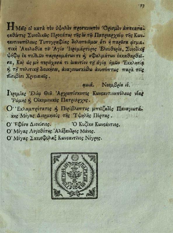 Ἀθανάσιος ὁ Πάριος. Ἡ Θεία καὶ Ἱερὰ Ἀκολουθία... Ἐλευθερίου..., Κωνσταντινούπολη, Τυπογραφεῖο Πατριαρχείου Κωνσταντινουπόλεως, 1811.