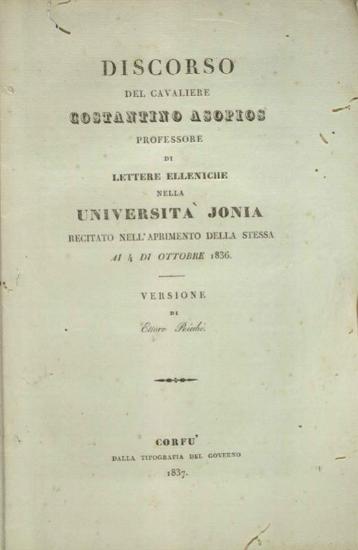 Κωνσταντῖνος Ἀσώπιος, Λόγος τοῦ ἱππότου Κωνσταντίνου Ἀσωπίου... ἐν τῇ Ἰονίῳ Ἀκαδημίᾳ... Τῇ δ΄ Ὀκτωβρίου 1836 Ε.Ν. // Discorso del Cavaliere Costantino Asopios... Versione di Ettore Ricchi, Κέρκυρα, Τυπογραφία τῆς Κυβερνήσεως, 1837.