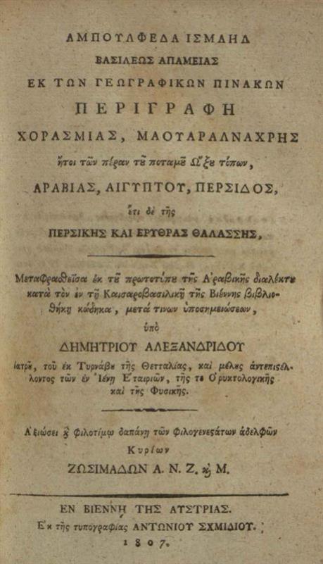 Ἀμπουφέλδα Ἰσμαὴλ (Abül-Fida). Ἐκ τῶν Γεωγραφικῶν Πινάκων περιγραφὴ... Μεταφρασθεῖσα... ὑπὸ Δημητρίου Ἀλεξανδρίδου..., Βιέννη, τυπογραφία Ἀντωνίου Σχμιδίου, 1807.