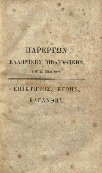Ἐπίκτητος - Κέβης - Κλέανθης. Ἐπικτήτου Ἐγχειρίδιον, Κέβητος Πίναξ, Κλεάνθους Ὕμνος, ἐκδόντος καὶ διορθώσαντος Α. Κ.[οραῆ], καὶ γαλλιστὶ μεθερμηνεύσαντος τὰ δύο πρῶτα, καὶ τὸ τρίτον, ἑτέρου... [Παρέργων Ἑλληνικῆς Βιβλιοθήκης Τόμος Ἕβδομος], Παρίσι, Τυπογραφία Ι.Μ. Ἐβεράρτου, 1826.