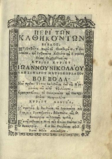 Νικόλαος Μαυροκορδάτος. Περὶ τῶν Καθηκόντων Βίβλος... Ἐπιμελείᾳ καὶ διορθώσει... Γεωργίου Τραπεζουντίου..., Βουκουρέστι, Τυπογραφία Μονῆς Ἁγίων Πάντων, Δεκέμβριος 1719.