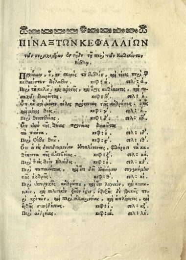 Νικόλαος Μαυροκορδάτος. Περὶ τῶν Καθηκόντων Βίβλος... Ἐπιμελείᾳ καὶ διορθώσει... Γεωργίου Τραπεζουντίου..., Βουκουρέστι, Τυπογραφία Μονῆς Ἁγίων Πάντων, Δεκέμβριος 1719.