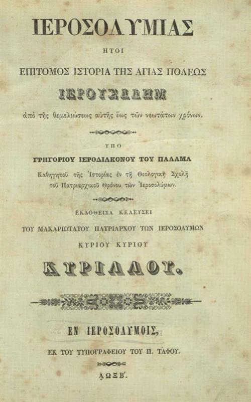 Γρηγόριος ἱεροδιάκονος Παλαμᾶς. Ἱεροσολυμιὰς ἤτοι Ἐπίτομος Ἱστορία τῆς Ἁγίας Πόλεως Ἱερουσαλὴμ ἀπὸ τῆς θεμελιώσεως αὐτῆς ἕως τῶν νεωτάτων χρόνων..., Ἱεροσόλυμα, Τυπογραφία Παναγίου Τάφου, 1862.