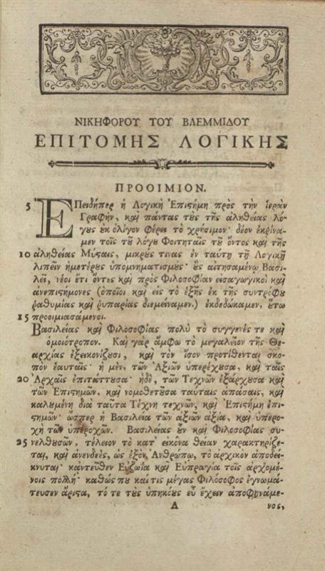 Νικηφόρος Βλεμμίδης. Νικηφόρου Μοναστοῦ καὶ Πρεσβυτέρου τοῦ Βλεμμίδου Ἐπιτομὴ Λογικῆς... μετὰ τῆς ἐπιτόμου αὐτοῦ Φυσικῆς... περὶ Σώματος τοῦ αὐτοῦ καὶ περὶ Ψυχῆς... Λόγος... ὁ περὶ... τῆς Ψυχῆς, Θεοφάνους... Μηδείας, καὶ Γενναδίου τοῦ Σχολαρίου... περὶ Πίστεως καὶ Ἀρετῆς καὶ Ἀσκήσεως τοῦ αὐτοῦ Βλεμμίδου, Προηγουμένης τούτων τῆς καθολικωτέρας αὐτοῦ Ἐπιστολῆς..., Λειψία, Τυπογραφία τοῦ Βρέιτκοπφ, 1784.