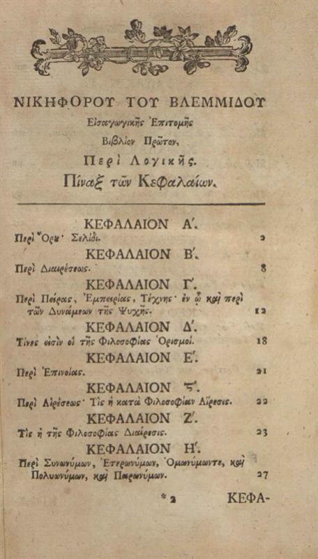 Νικηφόρος Βλεμμίδης. Νικηφόρου Μοναστοῦ καὶ Πρεσβυτέρου τοῦ Βλεμμίδου Ἐπιτομὴ Λογικῆς... μετὰ τῆς ἐπιτόμου αὐτοῦ Φυσικῆς... περὶ Σώματος τοῦ αὐτοῦ καὶ περὶ Ψυχῆς... Λόγος... ὁ περὶ... τῆς Ψυχῆς, Θεοφάνους... Μηδείας, καὶ Γενναδίου τοῦ Σχολαρίου... περὶ Πίστεως καὶ Ἀρετῆς καὶ Ἀσκήσεως τοῦ αὐτοῦ Βλεμμίδου, Προηγουμένης τούτων τῆς καθολικωτέρας αὐτοῦ Ἐπιστολῆς..., Λειψία, Τυπογραφία τοῦ Βρέιτκοπφ, 1784.