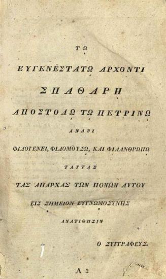 Adam Gorgid Scamm, Ἀδάμου Γοργίδα Σκαμνελίτου --- Εἰσαγωγὴ εἰς τὸ δημόσιον καθολικὸν δικαίωμα, Ἐξαχθὲν Ἐκ τῶν γνησίων ἀρχῶν τοῦ δικαιώματος τῆς φύσεως καὶ ἐφαρμοσθὲν εἰς χρῆσιν τοῦ δημοσίου εἰδικοῦ δικαιώματος Οἵωνδήποτε δημοκρατιῶν, εἴτε πολιτειῶν, Βούδα, Τυπογραφία τοῦ Πανδιδακτηρίου, Δαπάνῃ τοῦ Εύγενεστάτου Ἄρχοντος Σπαθάρη, Ἀποστόλου τοῦ Πετρινοῦ, 1825.