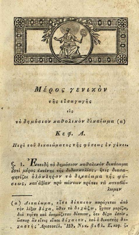 Adam Gorgid Scamm, Ἀδάμου Γοργίδα Σκαμνελίτου --- Εἰσαγωγὴ εἰς τὸ δημόσιον καθολικὸν δικαίωμα, Ἐξαχθὲν Ἐκ τῶν γνησίων ἀρχῶν τοῦ δικαιώματος τῆς φύσεως καὶ ἐφαρμοσθὲν εἰς χρῆσιν τοῦ δημοσίου εἰδικοῦ δικαιώματος Οἵωνδήποτε δημοκρατιῶν, εἴτε πολιτειῶν, Βούδα, Τυπογραφία τοῦ Πανδιδακτηρίου, Δαπάνῃ τοῦ Εύγενεστάτου Ἄρχοντος Σπαθάρη, Ἀποστόλου τοῦ Πετρινοῦ, 1825.
