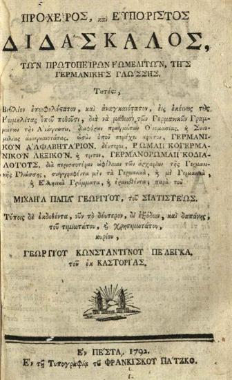 Μιχαὴλ Παπαγεωργίου. Πρόχειρος, καὶ Εὐπόριστος Διδάσκαλος, τῶν πρωτοπείρων ῾Ρωμελιτῶν, τῆς Γερμανικῆς Γλώσσης..., Πέστη, Τυπογραφία τοῦ Φρανκίσκου Πάτζκο, 1792.