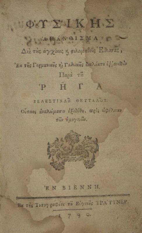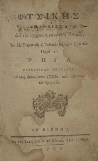 Ρήγας Βελεστινλῆς. Φυσικῆς Ἀπάνθισμα διὰ τοὺς ἀγχίνους καὶ φιλομαθεῖς Ἕλληνας..., Βιέννη, Τυπογραφία Τράτνερ, 1790.