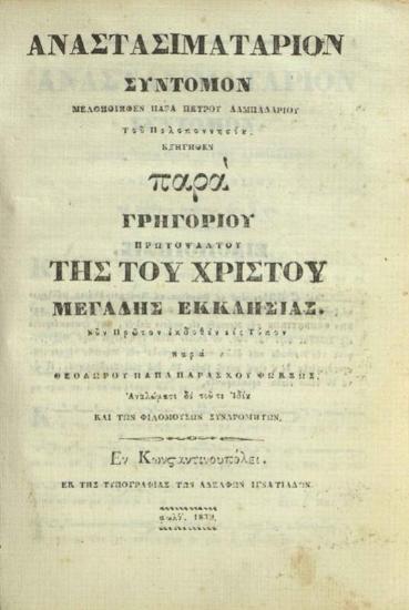- Ἀναστασιματάριον Ἀργὸν περιέχον τὰ Ἀναστάσιμα τοῦ Ἑσπερινοῦ, Ὄρθρου, καὶ Λειτουργίας, μετὰ τῶν Ἀναστασίμων Κανόνων, Ἀργῶν Καταβασιῶν, Τιμιωτέρων, Κατανυκτικῶν, Μαρτυρικῶν, καὶ Νεκρωσίμων, μετὰ τῶν ἕνδεκα Ἐωθινῶν ἐν τῷ τέλει..., μελοποιηθὲν παρὰ Πέτρου Λαμπαδαρίου τοῦ Πελοποννησίου... ἐπιδιορθωθὲν μετὰ προσθήκης, παρὰ Κωνσταντίνου Πρωτοψάλτου..., Κωνσταντινούπολη, Τυπογραφία τῶν ἀδελφῶν Ἰγνατιάδων, 1839.